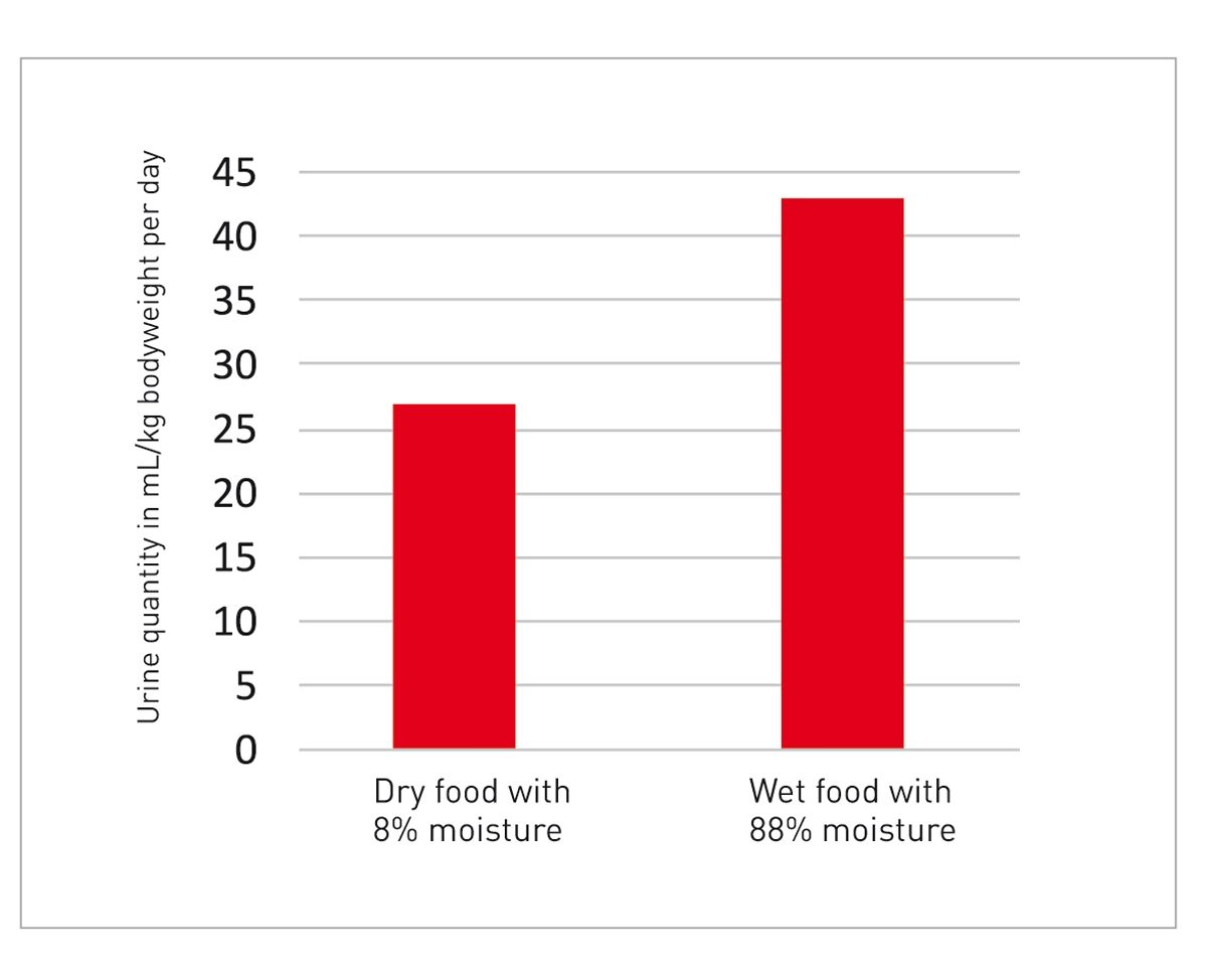 As the amount of food eaten is primarily determined by the animal's energy requirement7, food with a low-energy density and high-moisture content consequently leads to a higher fluid intake and so to an increased amount of urine 8, as shown in Figure 2 and Figure 3 . With commercial dry diets, which contain a maximum of 10% moisture, cats must drink additional water to meet their needs. Most studies on this topic conclude that when cats are fed only dry food, they consume less water in total 9 10 11 and it is therefore often proposed that feeding mainly or only dry food is a risk factor for kidney and urinary tract disease, although studies to date show contradictory results.